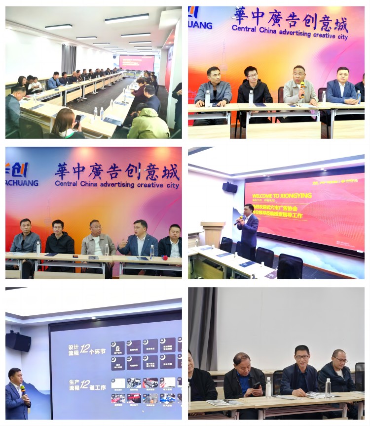 一行人首先参观了武汉商贸职业学院雄鹰广告产业学院的设计工作室。墙上悬挂的业务流程标准引起了协会领导们的浓厚兴趣,他们纷纷表示这些资料对于行业内的交流与学习具有极高的价值。随后,大家齐聚会议室,观看了学院与公司的宣传片。当了解到公司员工不畏艰难,参与雷神山、火神山标识标牌的设计、制作与安装工作时,大家对这种奉献精神给予了高度评价。座谈会上,大家就广告行业的发展趋势、人才培养及技术创新、促进广告行业的繁荣与进步等议题展开了深入的探讨。
