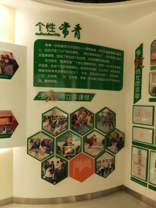 我公司在历经15天时间,完成了武汉市常青第一中学的校园文化的建设与校史馆的设计与制作,该校秉承“追求卓越,个性常青”的学校精神,坚持“教育因欣赏而美丽”的办学理念,本着“满足不同学生的发展需求,给每一个学生发展的机会”的育人思想,确立了“个性因欣赏而彰显,差异因欣赏而多彩”的育人视角,努力为每一位学生的发展奠基。